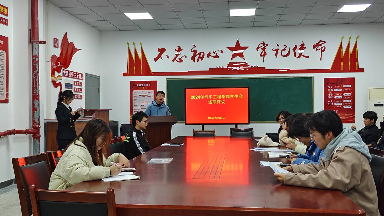 为进一步加强学生骨干队伍建设,推动学生会管理工作科学化、规范化,提高学生会骨干工作积极性和责任意识,搭建沟通交流桥梁,汽车工程学院于12月25日下午6点在汽车楼405会议室召开2024-2025学年第一学期学生会干部述职评议会。该院团支部书记毛炜、学生会主席严承政及各部门负责人参加评议会,汇心湖校区主席团及各部门负责人线上参加会议。