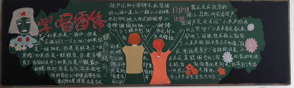 这次板报评比活动引起了全院师生的高度重视。各在校班级积极参与,大家在板报报头设计、内容选编、文字排版、插图描绘等方面下足了功夫。各班紧紧围绕“青春雷锋行,志愿暖人心”的主题,对雷锋的相关话题进行全方位、多角度刊载介绍,让同学们充分了解雷锋、学习雷锋、内化自我。各班板报内容丰富,题材多样,有的介绍雷锋生平事迹,有的宣传雷锋的感人故事,有的再现雷锋日记,有的收集雷锋名言录,有的摘抄伟人题词,有的解析雷锋精神等。