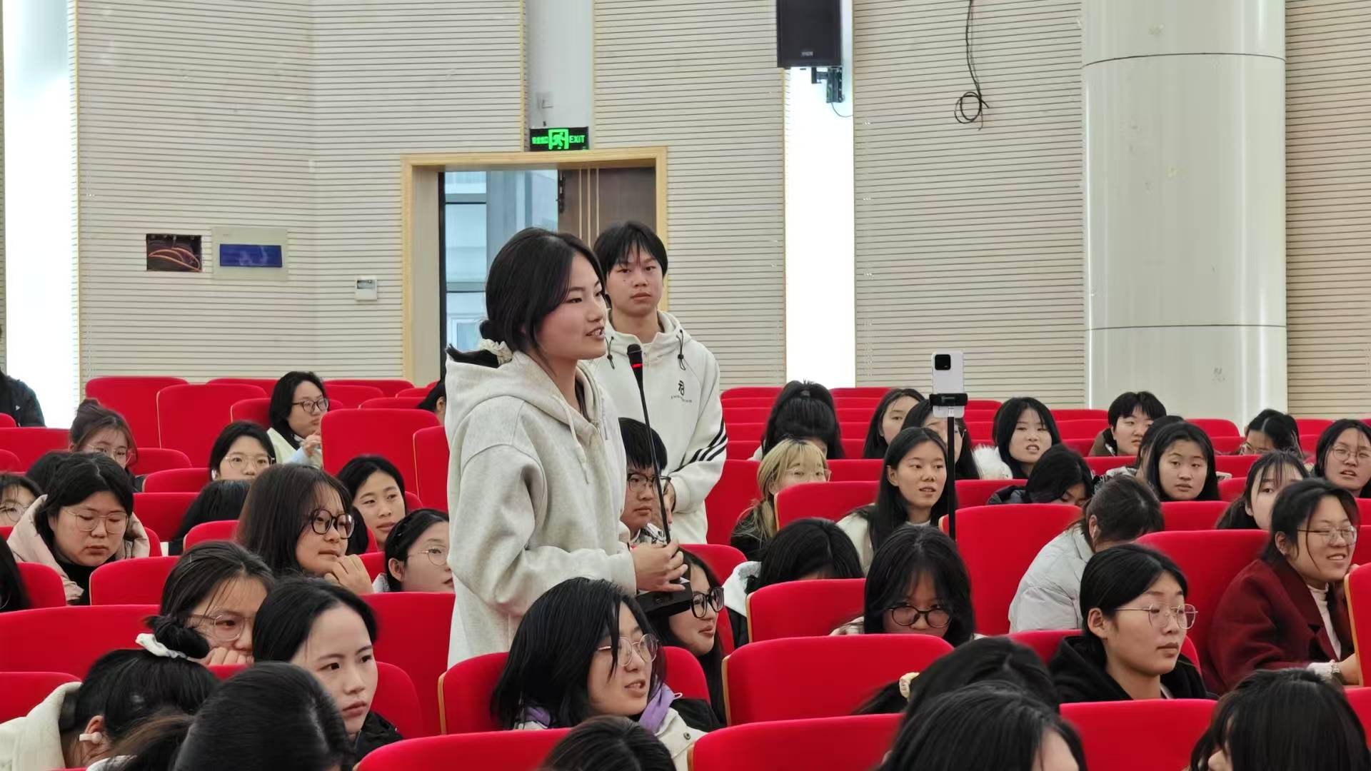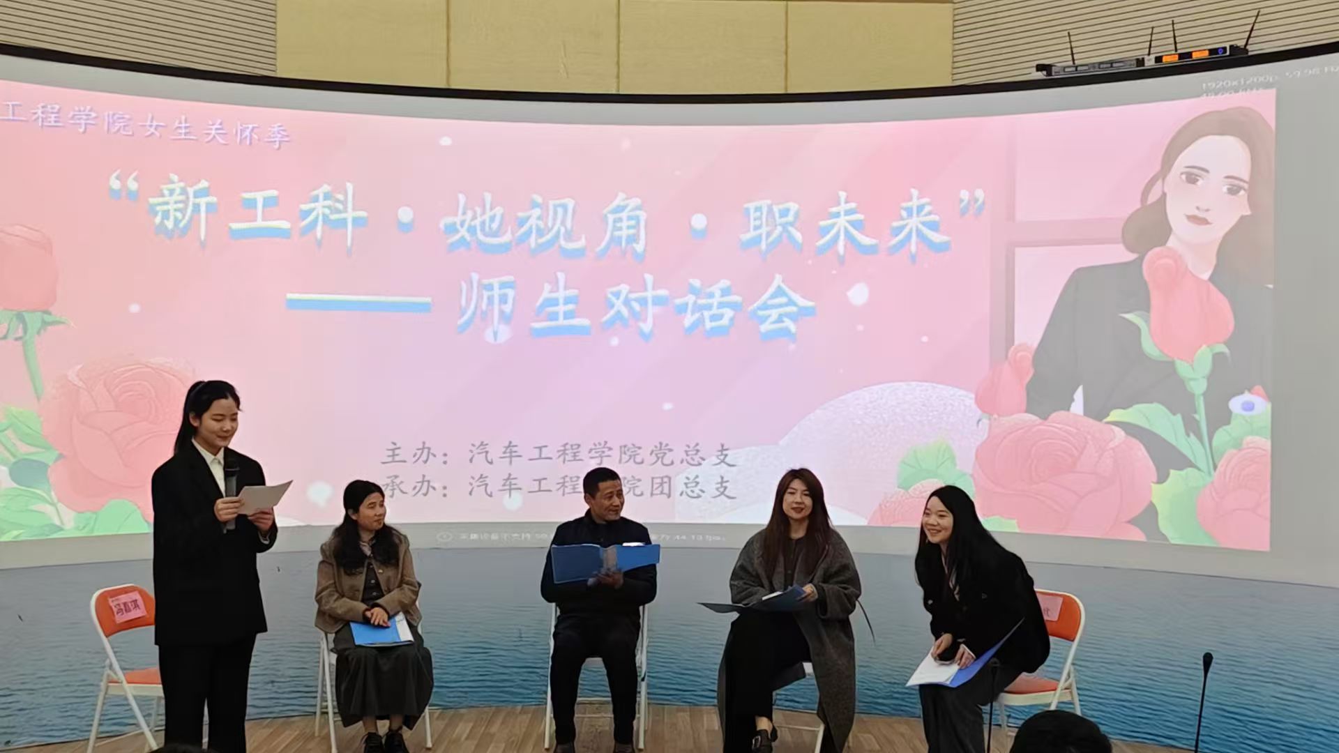 启动仪式结束后,“新工科?她视角?职未来” 师生对话会正式开场。本次对话会由 23 汽营一班冯嘉琪主持,通过线下讨论与线上抖音直播的形式,吸引了全院女生及众多线上观众参与。