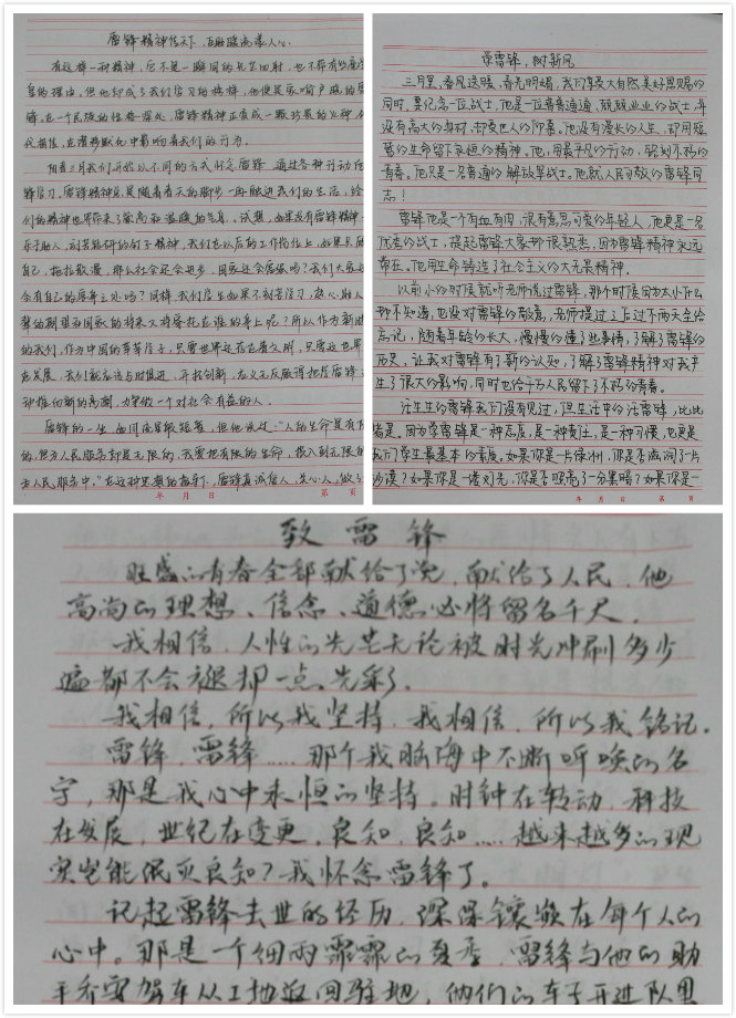 在征文比赛中,同学们用一支支笔描述雷锋同志的生平事迹,解读雷锋日记和雷锋语录,给出了自己对新时代雷锋精神的理解;并结合身边的动人事例,讲述自己和身边的好人和好事,畅谈心得体会。