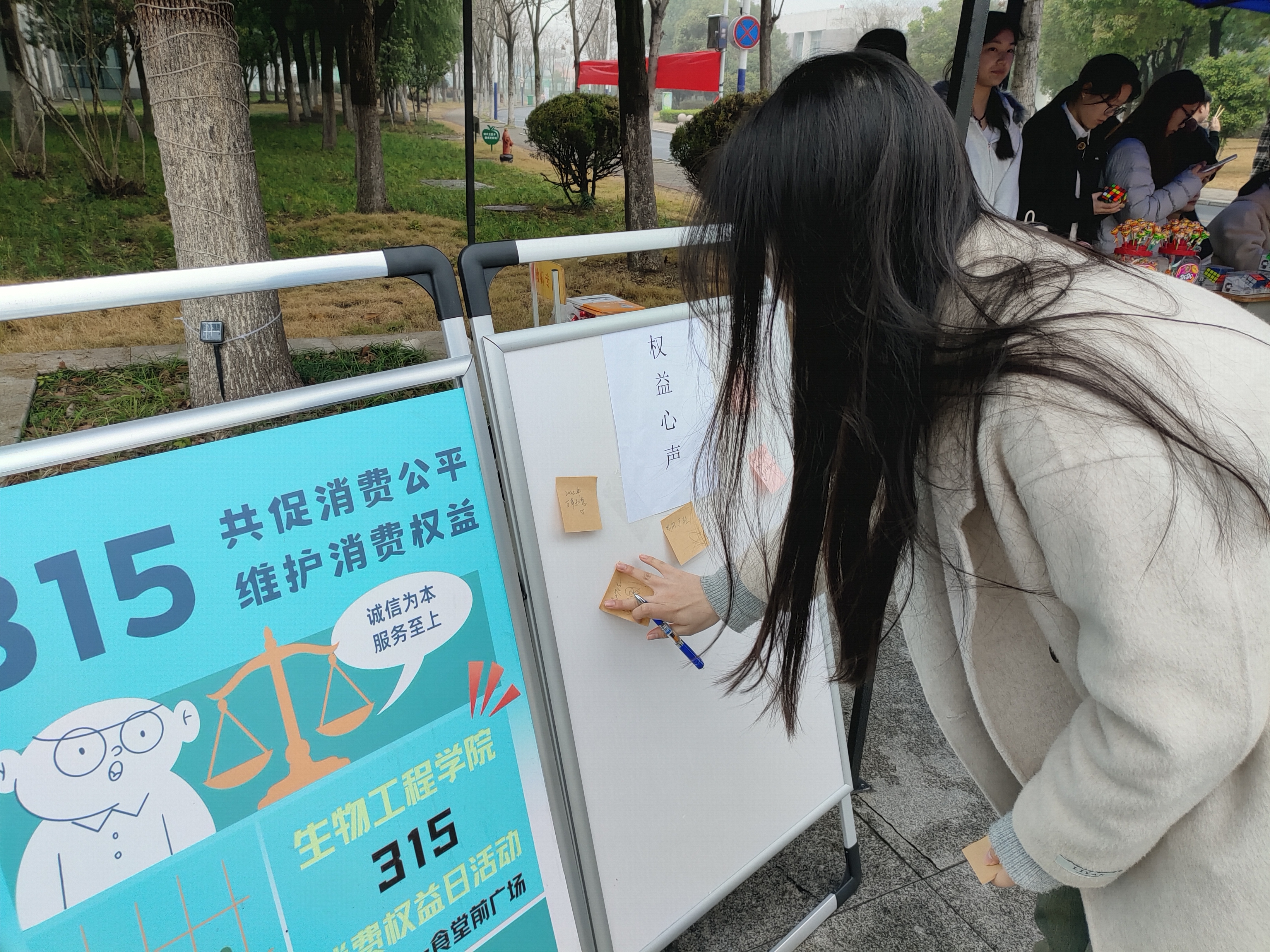 活动当日,内容丰富多样,分为主题展示和趣味互动两部分,在主题展示中,利用展板展示维权案例并且设置“权益心声墙”,收集了生物工程学院同学们的消费经历。活动现场设立了趣味活动,如“权益知识问答”“魔方竞速挑战”“留言兑奖”等。来自全校近300名同学们积极踊跃参加,通过答题、完成魔方还原或在“心声墙”留言等兑换了棒棒糖、可乐、布偶等奖品。