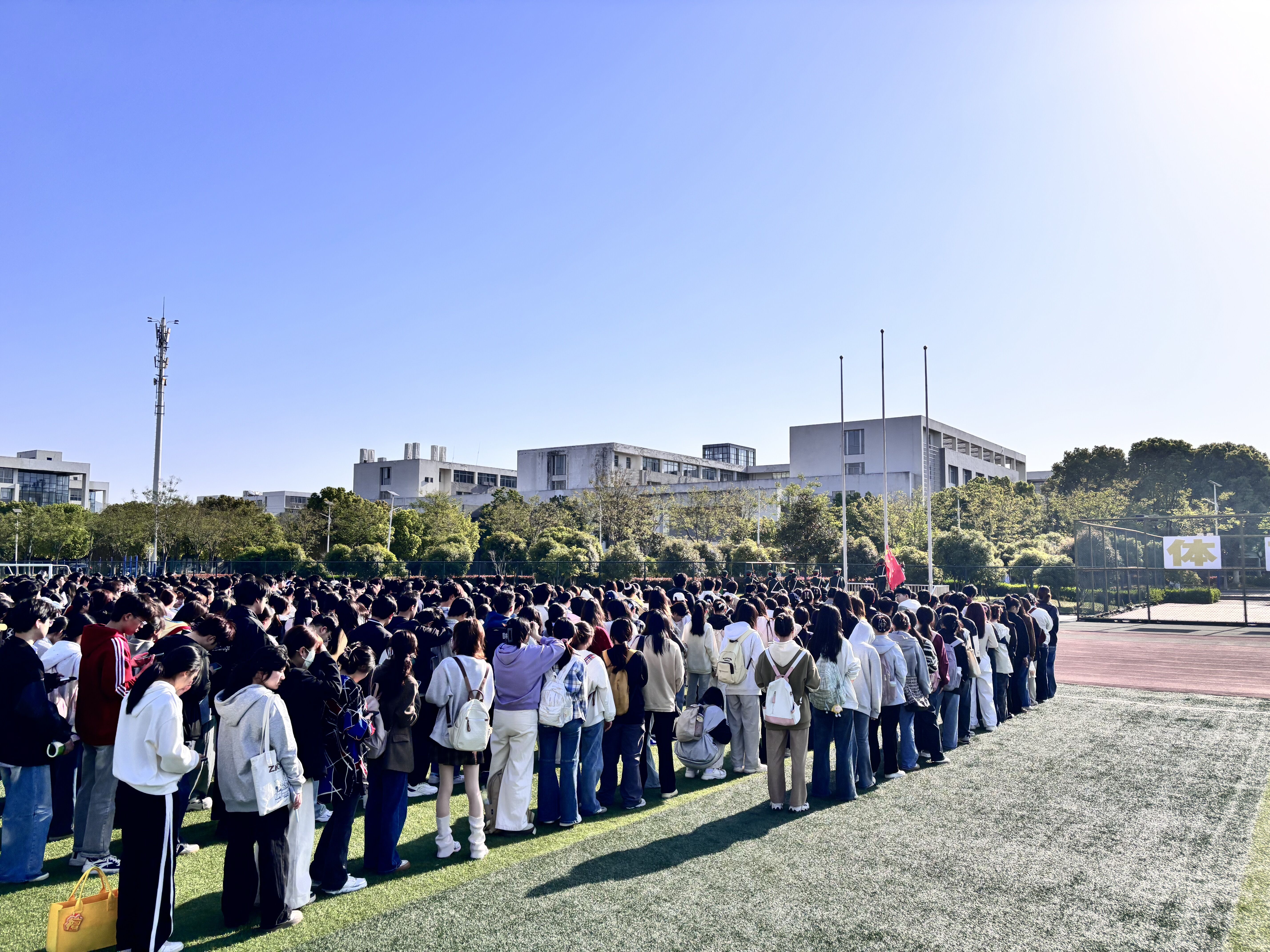升旗仪式伊始,现场气氛庄严肃穆。八点整,国旗护卫队成员迈着整齐有力的步伐,步入仪式现场。随着国歌奏响,五星红旗徐徐升起,全体师生面向国旗行注目礼,表达对祖国的无限热爱和崇高敬意。