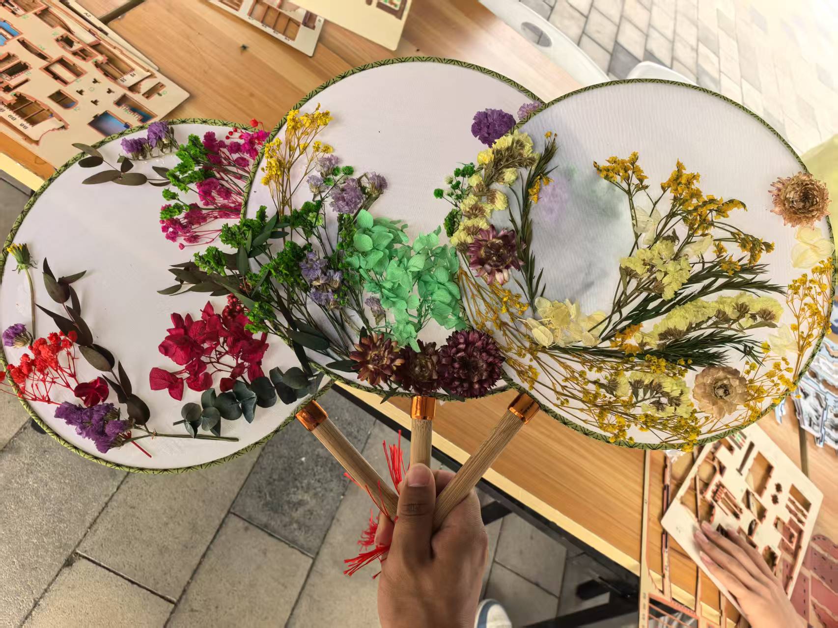 创意手工区吸引了众多手工爱好者。志愿者们提前准备了南湖红船模型、永生花团扇及养生锤材料包,并现场讲解制作技巧。在红船拼装环节中,同学们通过榫卯结构还原中共一大历史场景,感受“红船精神”的深刻内涵;团扇制作区花香萦绕,女生们将干花与古典扇面结合,创作出独具匠心的作品;养生锤则融入中医文化,制作完成后被赠予现场教师,传递感恩之情。一件件作品不仅是动手实践的成果,更成为红色教育与劳动教育融合的生动载体。
