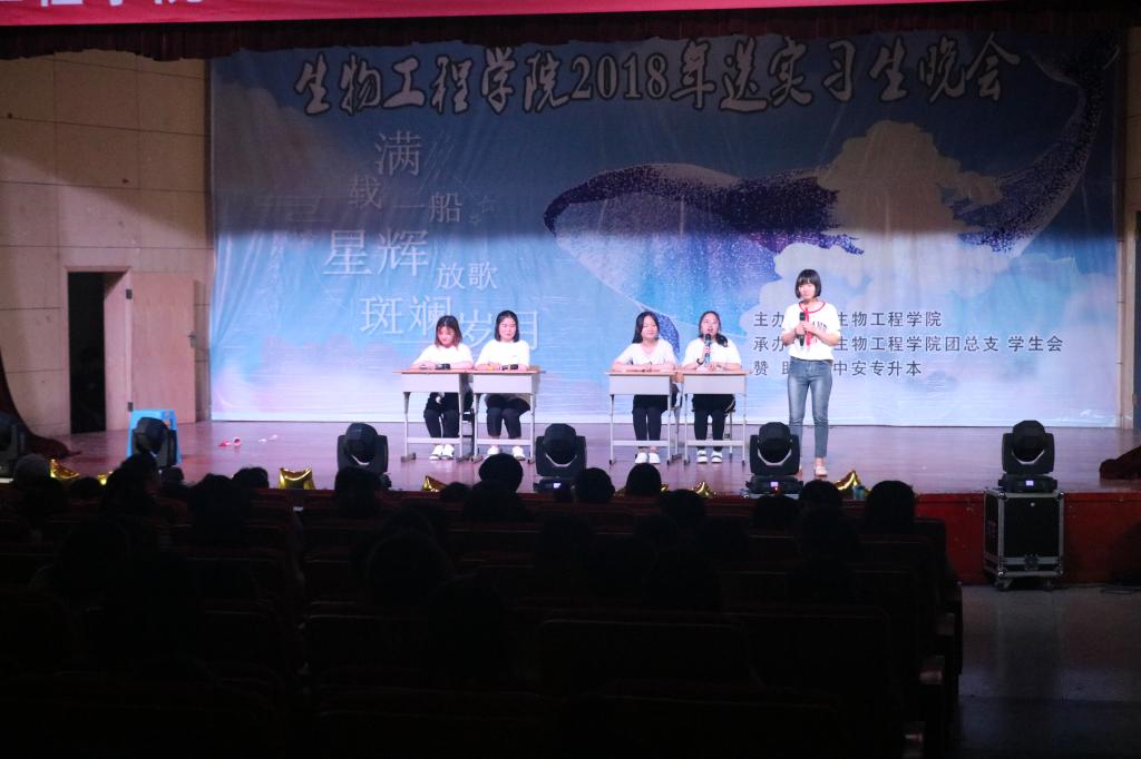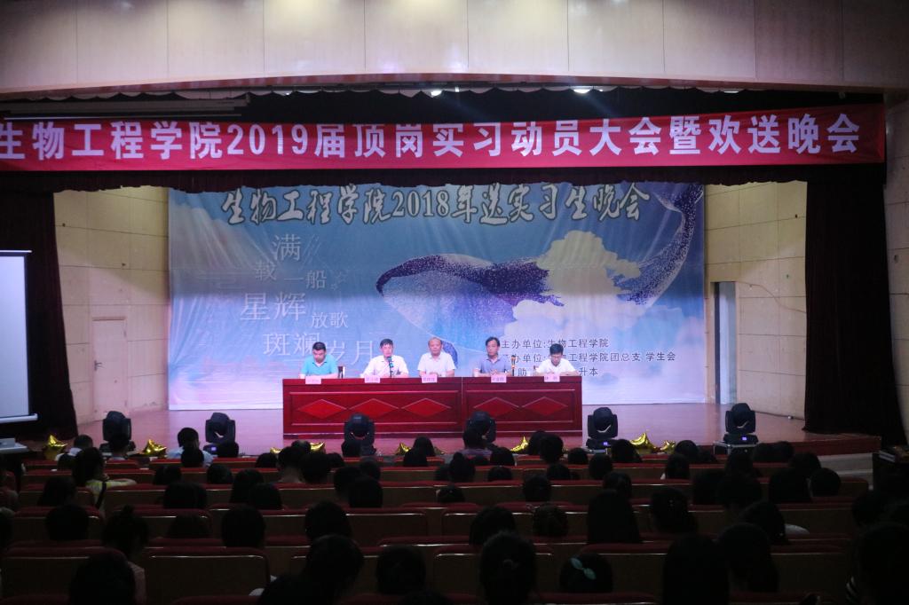 为做好生物工程学院2019届实习生动员工作,让学生明确实习目的、意义及要求,5月17日下午在大学生活动中心举行2019届毕业生顶岗实习动员大会曁欢送晚会。学校党委委员、副校长周晓隆,生物工程学院党总支书记宁业群,副院长(主持工作)裴正峰,党总支副书记林胜,副院长刘修树,以及各顶岗实习班级辅导员、实习指导老师和全体2019届毕业生出席了大会,大会由裴正峰主持。