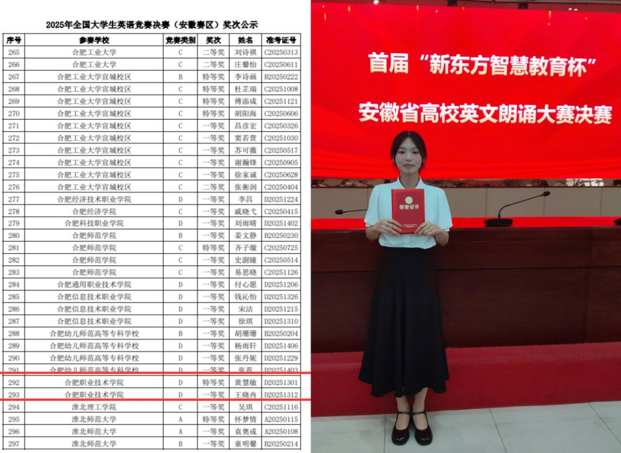 近期,我校学子在省级英语竞赛中捷报频传。5月10日,在2025年度全国大学生英语竞赛(安徽赛区)决赛中,基础教育学院选派党员教师尹悦、杨凌担任指导教师,全程跟踪指导。经过激烈角逐,尹悦老师指导的经贸旅游学院黄慧敏同学荣获最高奖项“特等奖”,杨凌老师指导的医学院王晓冉同学斩获“一等奖”。尤为可喜的是,这是我校继2021年、2024年后,第三次摘得该赛项省赛特等奖桂冠,书写了新的骄傲篇章。