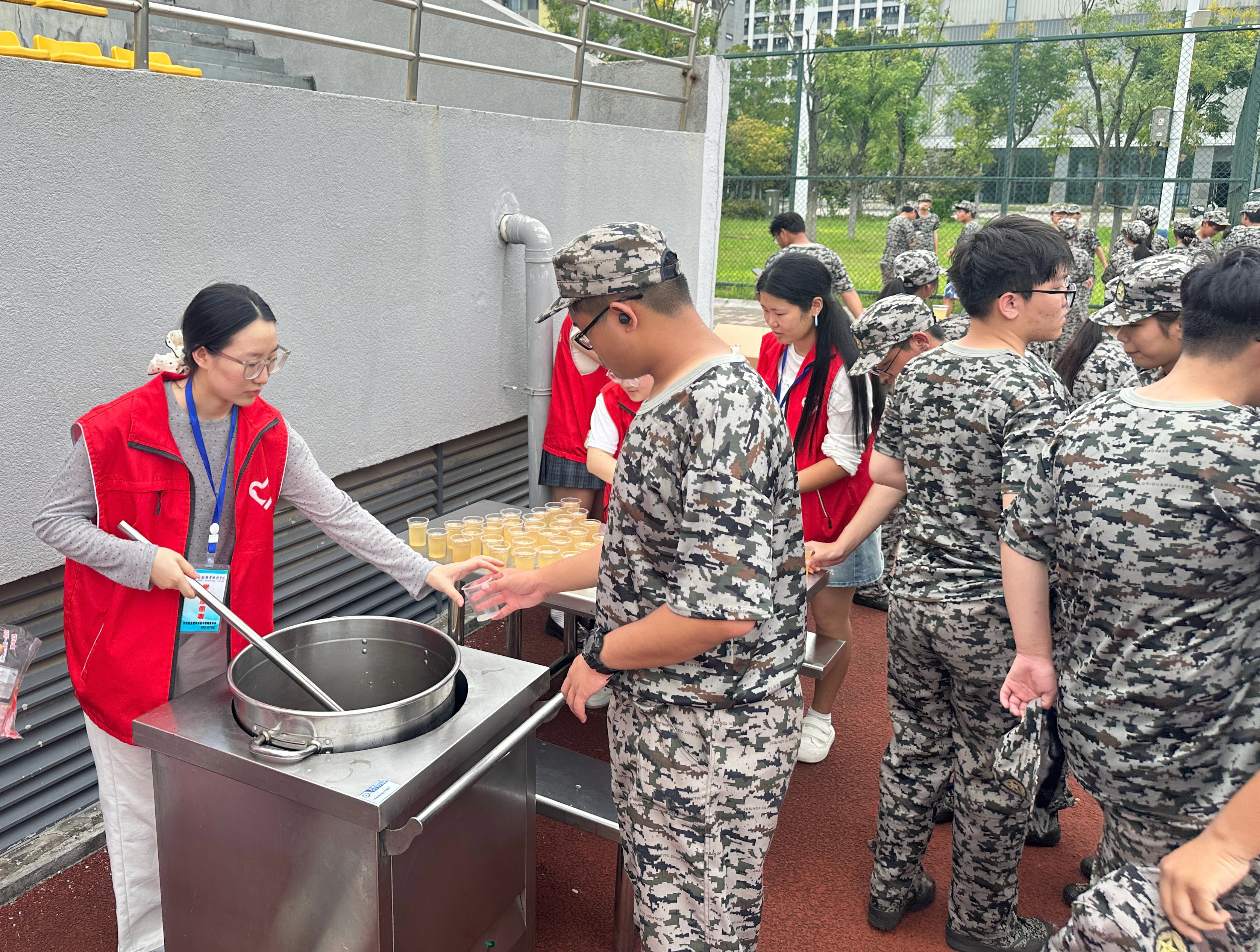 活动前期,校级学生组织提前规划、精心筹备,通过调研新生需求,采购了菊花茶、绿豆汤、面包、饼干、棒棒糖等降温充饥物资,并组建了由学生干部、志愿者组成的“送清凉”服务队。活动当天,志愿者们提前抵达军训场地,将物资整齐分装。当训练间隙到来,军训新生们在送清凉处排队等待,将物资一一递到新生手中,同时贴心提醒大家注意补充水分、做好防晒,若出现头晕、乏力等不适及时告知教官。