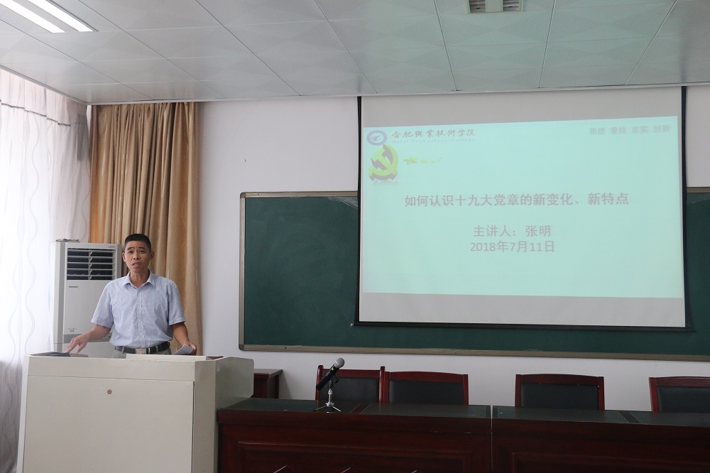 为深入学习贯彻党的十九大精神,让党员深刻领悟新党章、体会新党章的新变化、新特点,按照学校党委要求,护理学院党总支于7月11日下午在医学北楼210会议室开展2018年七月份党员活动日,院党总支书记张明以《如何认识十九大党章的新变化、新特点》为主题为全体党员教师上了一堂主题鲜明、内容生动而精彩的专题党课。