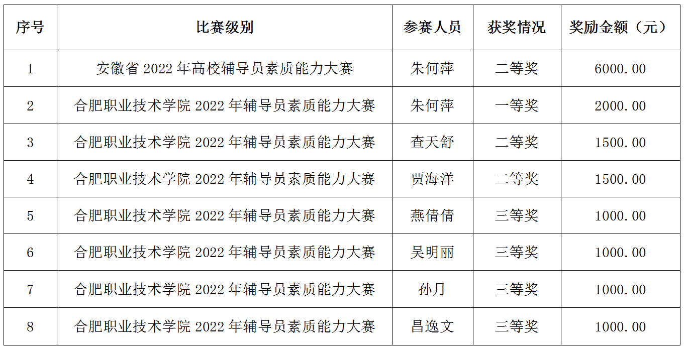 根据《合肥888集团学院职业技能竞赛项目管理与经费使用暂行办法》,现拟对在2022年度省级和校级辅导员素质能力大赛中获奖参赛选手进行奖励,公示如下: