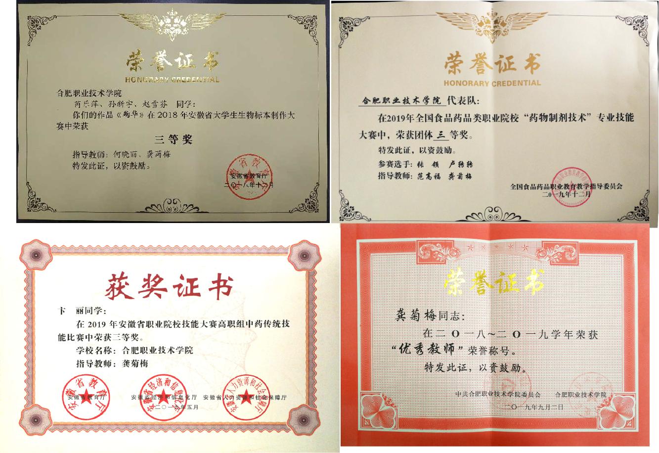 入校的7年内,龚菊梅老师先后担任了《药物制剂技术》《药物化学》《天然药物化学》《药事管理与法规》等课程的教学工作。在教学过程中她不断总结经验,向有经验的老教师学习,不断提高自己的教学水平,自2015年入校以来,获得教学质量考核“优秀”等级6次,合肥市事业单位考核“优秀”等级2次,校级“优秀共产党员”1次,“师德先进个人”1次,“优秀教师”2次,“优秀女职工”2次,“优秀班主任”1次,“优秀社团指导老师”1次。
