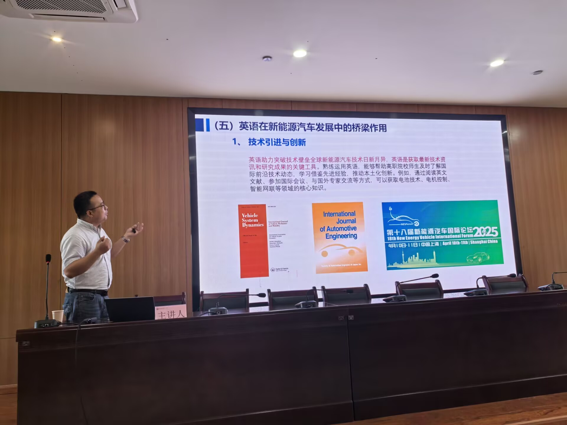 5月21日下午,基础教育学院在汇心湖校区图书馆一楼学术报告厅成功举办了一场别开生面的跨学科对话——特邀合肥工业大学张冰战副教授主讲的《新能源汽车技术演进与英语的桥梁作用:现状与展望》专题报告。报告会由该院教学办主任尹悦主持,该院党政主要负责人、英语教研室教师及新能源汽车技术专业学生代表参加,现场气氛热烈。