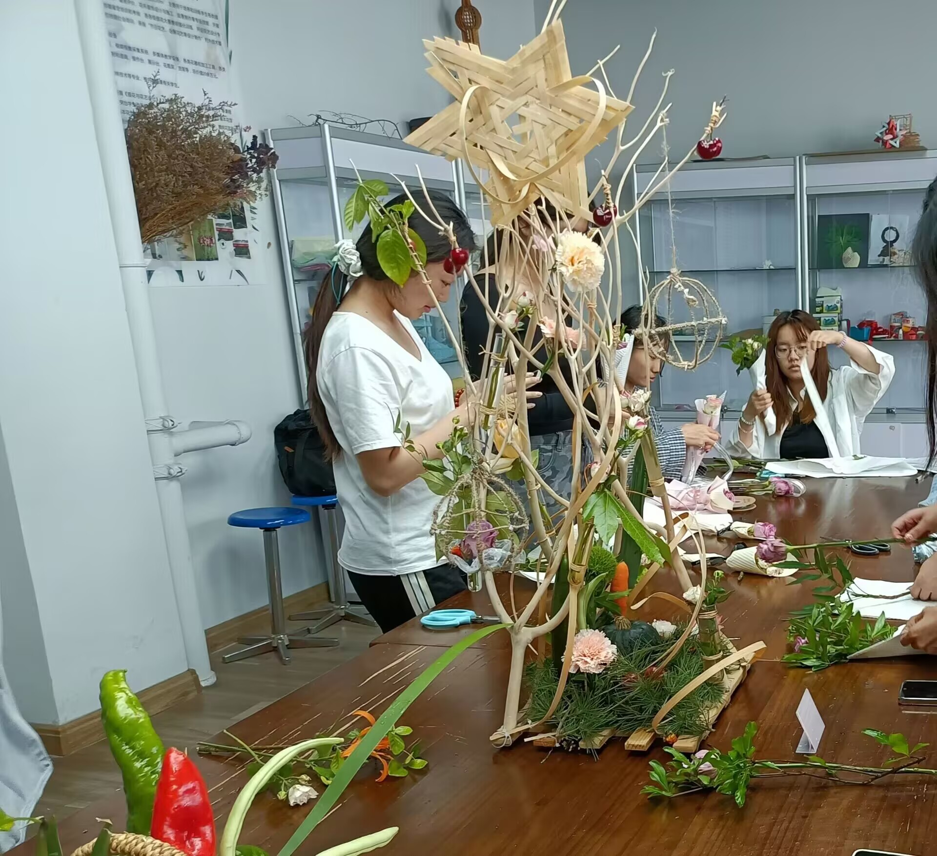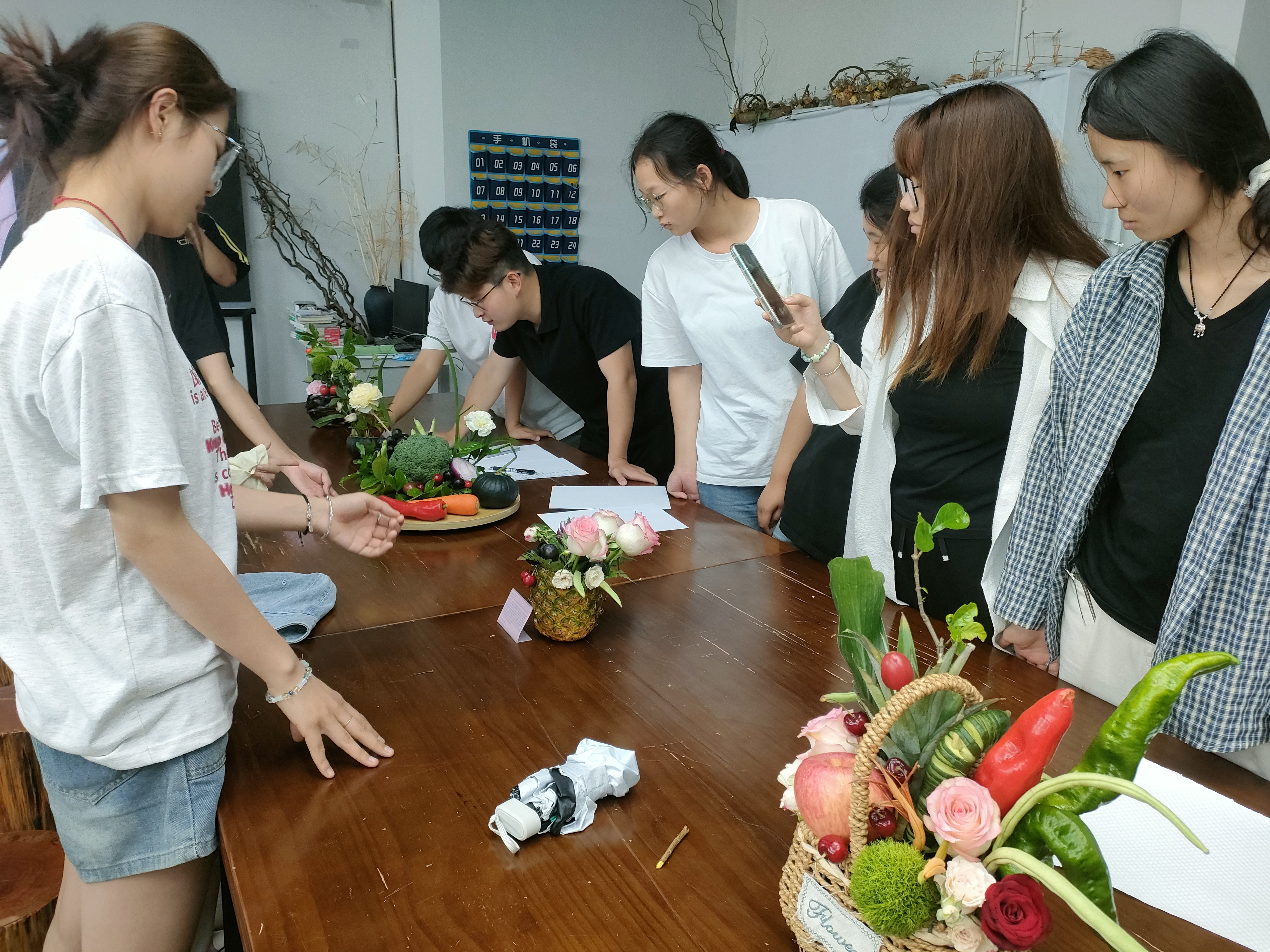 蔬果创意插花模块,引来同学们的纷纷围观,水果、蔬菜和鲜花的碰撞,让同学们深刻感受到生活中的点滴元素皆可成为艺术创作的灵感源泉,为生活增添无限诗意。