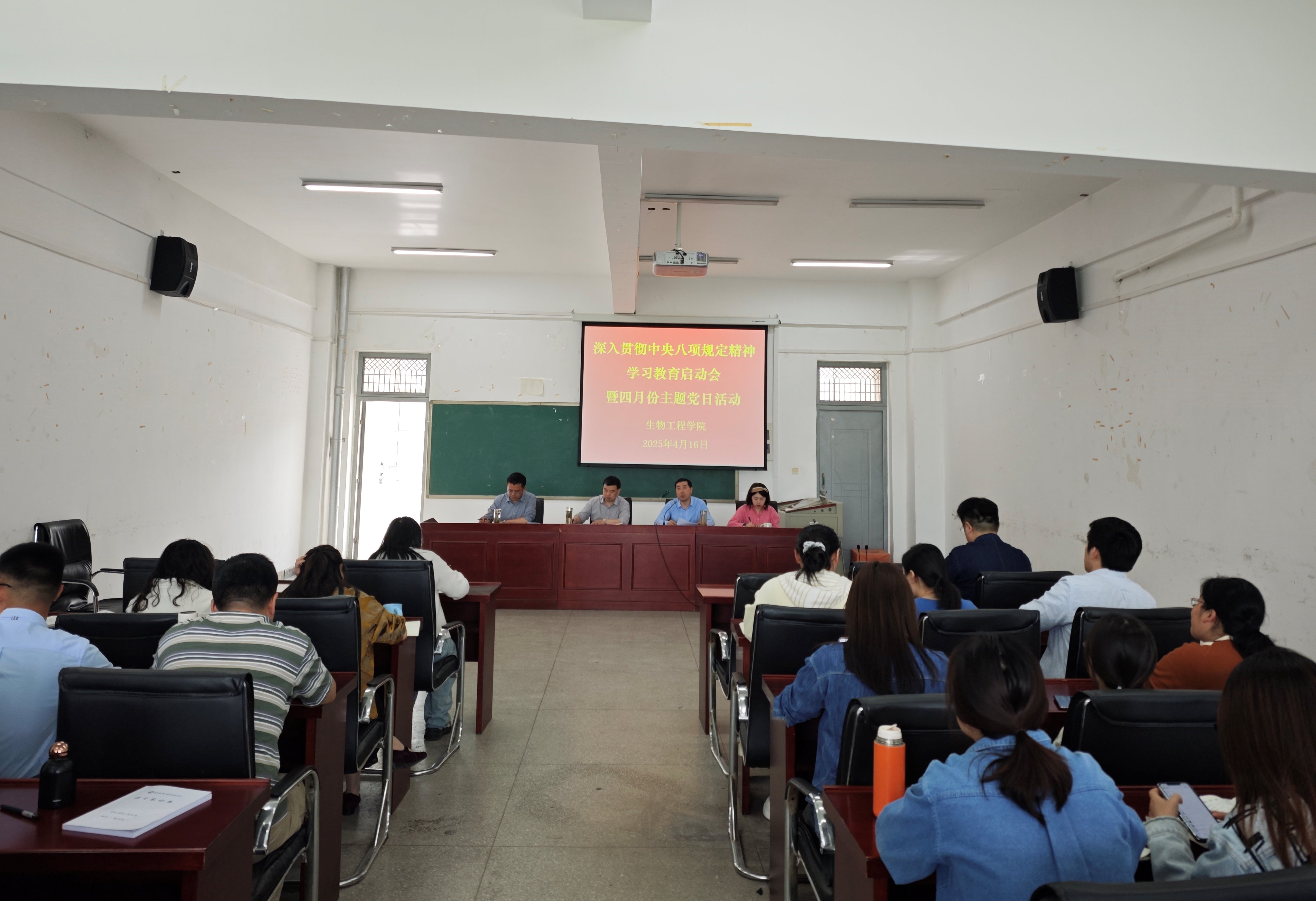 4月16日下午,生物工程学院党总支在生化楼A305召开深入贯彻中央八项规定精神学习教育动员部署会暨四月份教职工政治理论学习会,会议由学院党总支副书记(主持工作)慈龙保主持,全体教职工参加会议。
