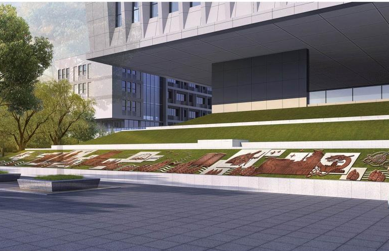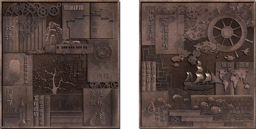 设置在学校图书馆东门,浮雕以求实创新为线索,将学校的专业和发展方向有机结合,以学校的专业符号与学习的场景和文字为元素展开设计。其间的河流贯穿始终,寓意求实是源、创新是本,以此鼓舞学生要奋发图强,开拓创新。