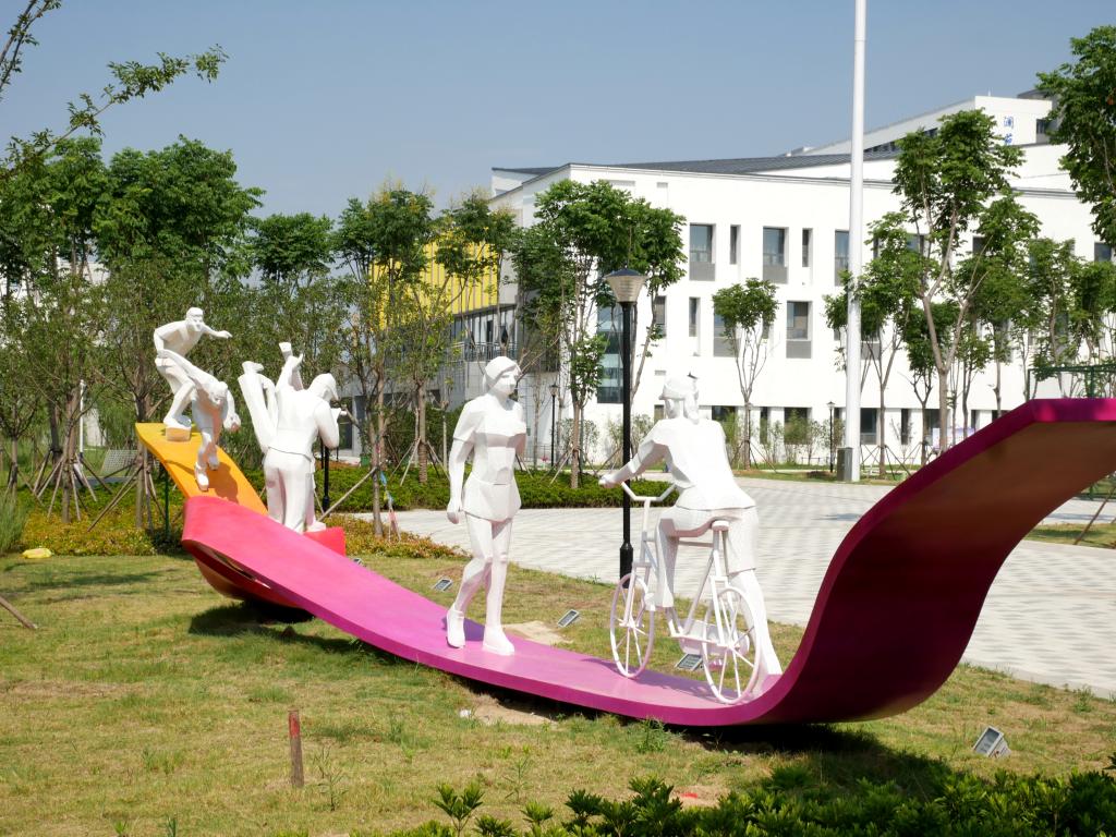 本雕塑以舞动青春为主题,以自行车、滑轮、街舞为设计元素,采用剪纸钢板和网格的形式来体现大学生活的青春活力。造型轻盈,简单时尚,色彩丰富,动感十足。设置在校园的运动区,使作品与环境相得益彰,生动有趣。