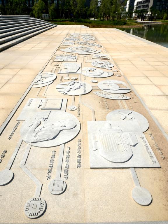 地雕位于汇德广场西端,以学校的特色专业为元素,通过电路板的造型载体向四周不断的延展。如同智慧之树,蓬勃发展。作品方、圆造型符号错落有致,不断叠加,不断变化,如同激扬的乐曲演奏出澎湃的乐章。寓意学校在多个专业领域培养出面向社会的有用之才,向着未来、向着希望高歌永奏。