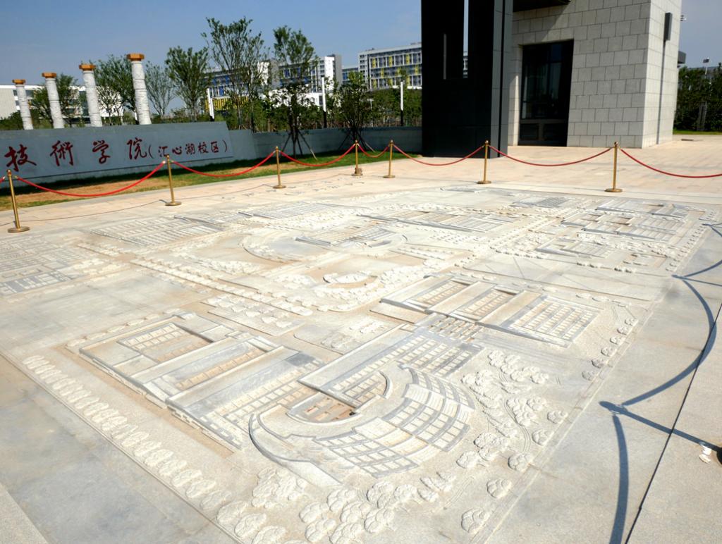 位于学校东大门入口处,地雕以时间为轴,将学校的发展历史有机结合,以学校不同时期的建筑风貌为元素缓缓展开,犹如流淌的河流不断汇集,流向新的地域,进入崭新的发展时代,使学校具有历史的记忆和未来的憧憬。