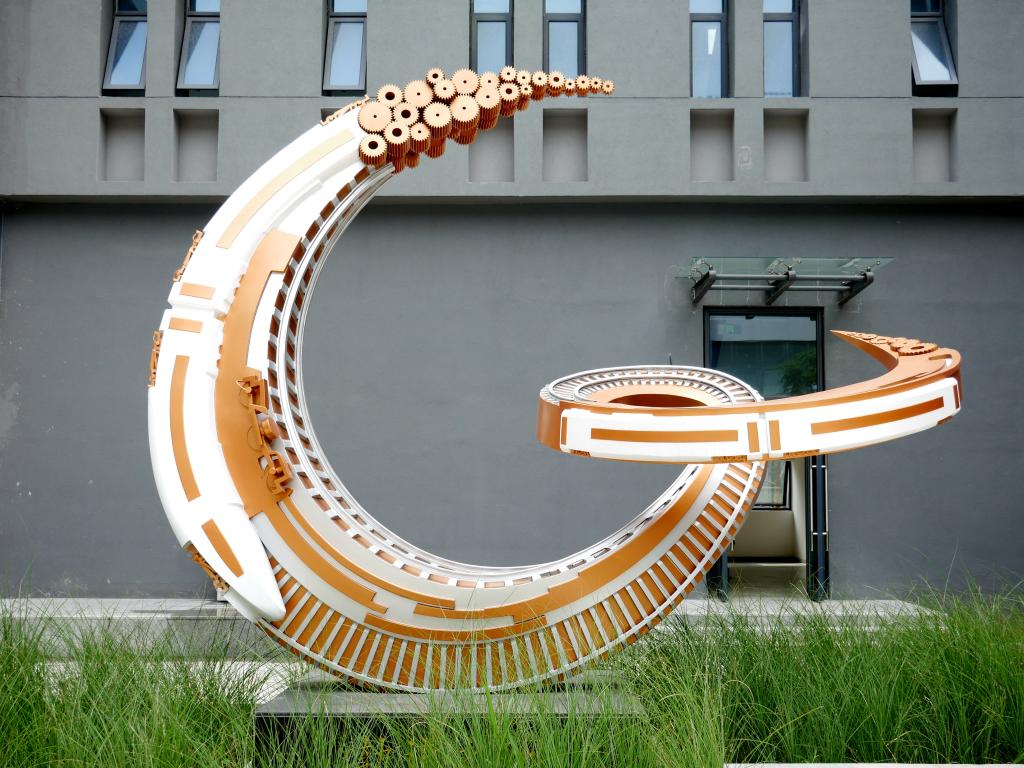 雕塑以纵横交错的轨道为造型载体,将飞驰的列车与车轮等交通元素融入其中,表达出“阡陌交通、纵横四海”的文化主题,同时作品表面采用不锈钢本色和黄铜色交织,既体现出时代感也强化了专业性。作品整体造型丰富而富有动感,给人以穿越和延伸的遐想。作品灵动的空间造型为规整的院落平添了几分活力与激情。
