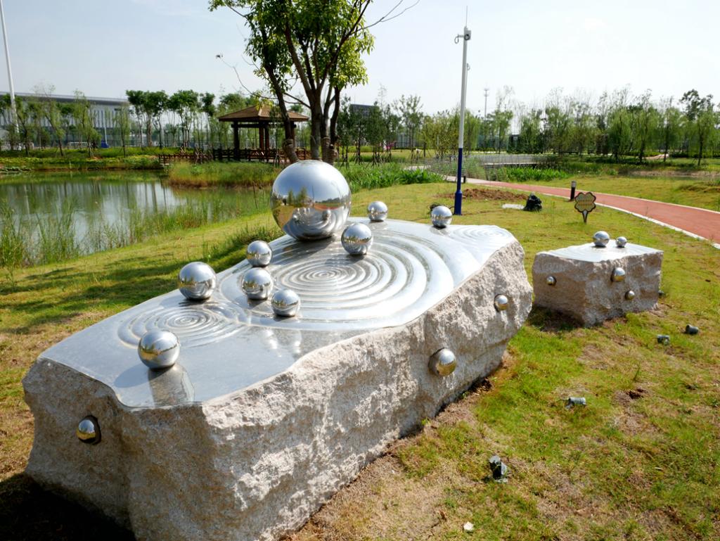 作品将不锈钢锻造成波澜的水面与石头巧妙结合,点点飞珠水溅,寓意知识的积累犹如雨滴汇聚成河,汇入大海。暗示学子兼收并蓄、博观约取,厚积薄发、挂帆沧海。