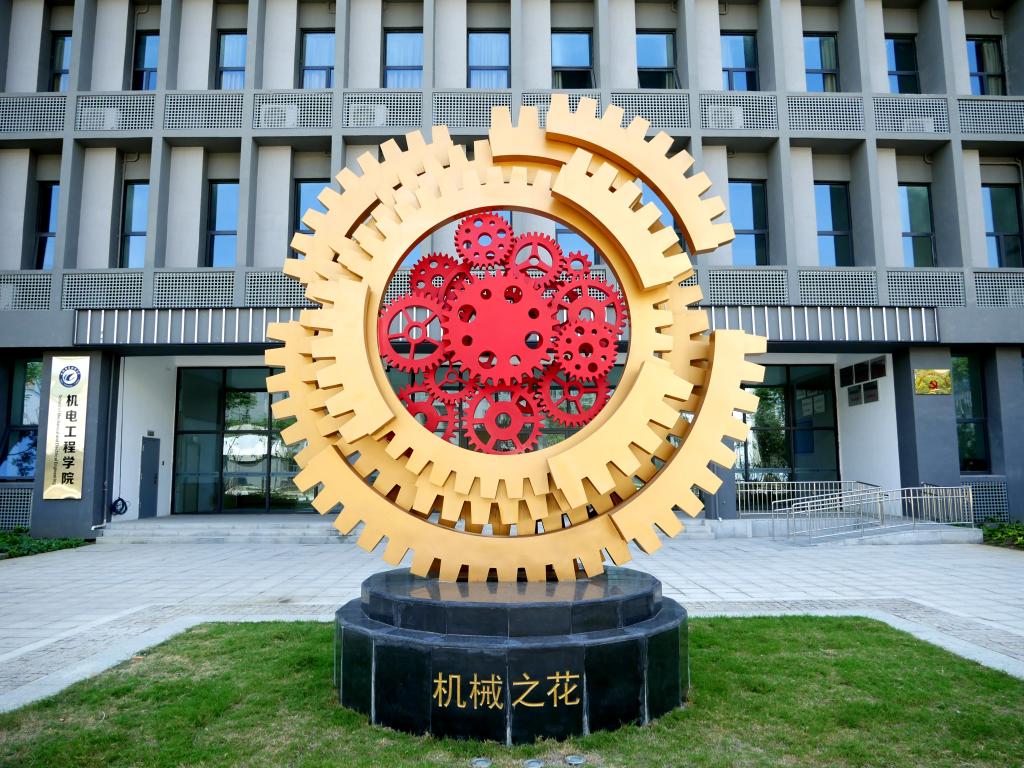 雕塑位于机电工程学院入口处,以机械原件典型代表齿轮为创作元素进行有机结合,以向日葵为设计表达对象。以此象征机电工程学院开足马力向着明天的辉煌不断开拓与进取。同时富有很强的标识性和趣味性,为整个校园风光添光加彩。
