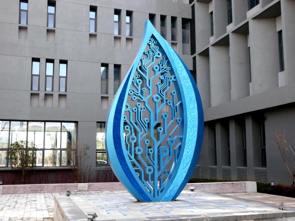 雕塑以绿叶为造型载体,以科技线条和叶脉为创作元素。通过扩散的科技线条表达人类的思维张力,通过轮廓的有效约制,寓意科技的发展应该实事求是,为人类与万物的有序发展而贡献无限的力量。雕塑科技蓝的色彩基调使雕塑更加深邃而科幻,镂空的叶脉处理使得作品与空间院落有机结合。