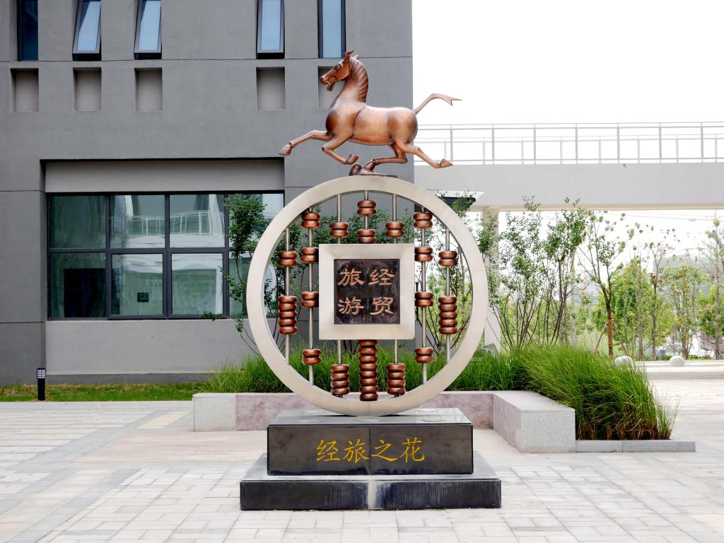雕塑以经贸旅游学院为表现对象,将古铜币、算盘、印章与中国旅游行业标志“马踏飞燕”等文化元素有机结合,造型生动、明快。作品在材质上运用不锈钢与紫铜相结合,使作品在现代手法中诠释出传统文化的独特魅力。