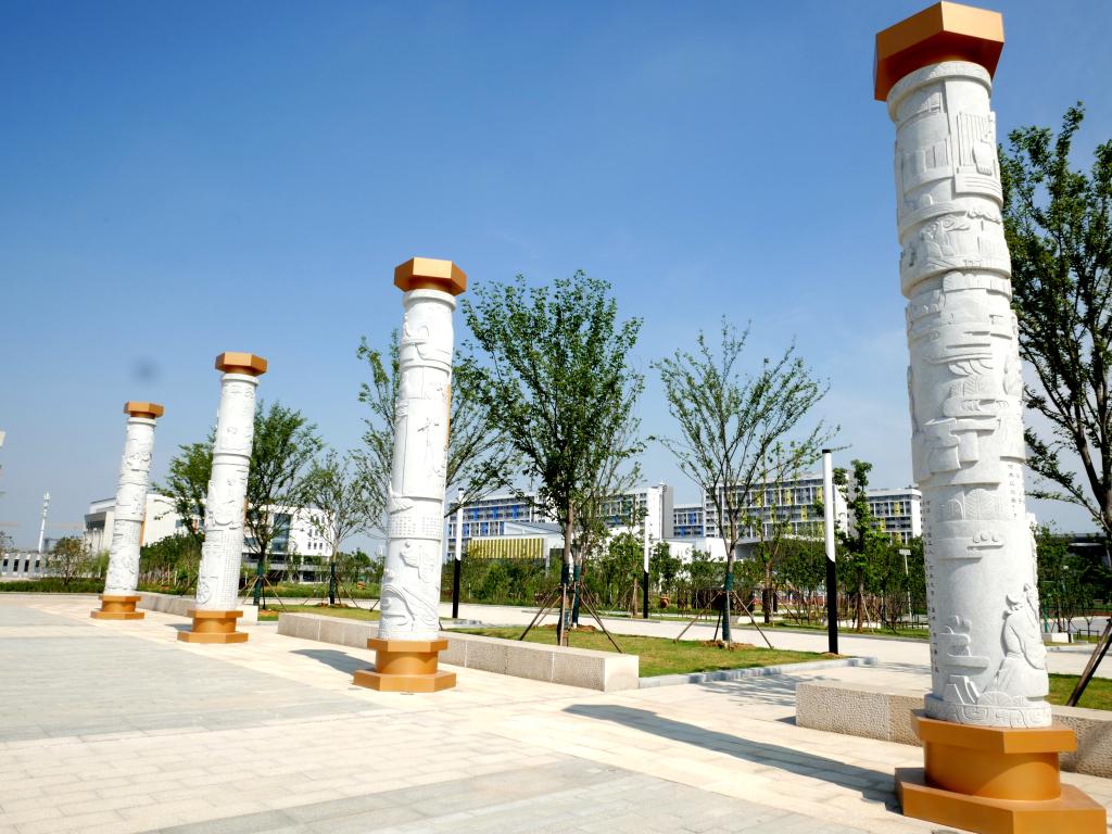文化柱以“百行汇贤”为设计主题,共八根,上刻浮雕。采用了中国传统文化“工匠精神”中的“铁杵成针”“切磋琢磨”“庖丁解牛”“匠石运斤”“鬼斧神工”“得心应手”“唯手熟尔”“大匠斫轮”等寓言故事,同时结合本校区的特色专业,以一种继承与弘扬,汇聚与传承的精神展示学校新面貌,吸引百行的贤德之才,培养优秀的学子走向社会,为国家的发展做出应有的贡献。