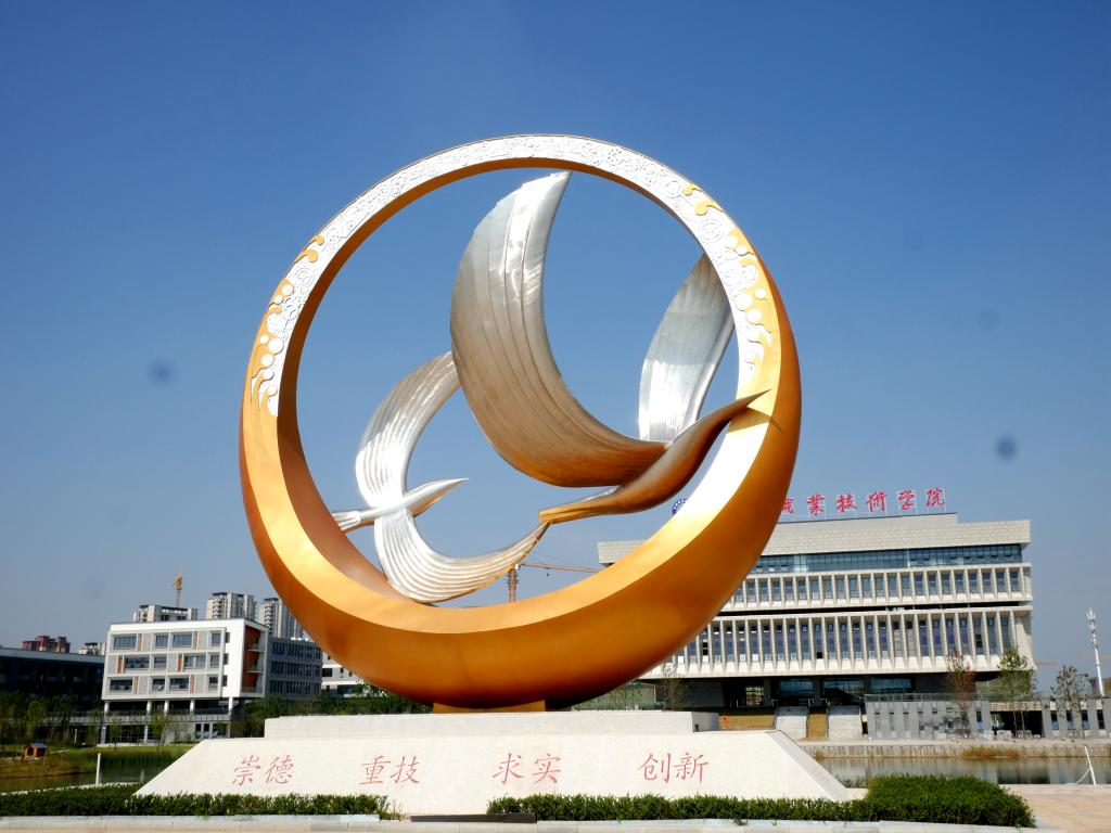 雕塑位于汇德广场西端临湖区域,为广场的视觉中心。雕塑创意以学校校徽为载体,以日月、翱翔的飞雁、浪花和象征着工业的齿轮为元素有机结合,在色彩上采用金色和银色交织,整体作品寓意在新的时代格局中,学校承前启后、继往开来,犹如初升的金日,又如职教蓝天奋飞的领头雁,正以全新的面貌承担着为社会、为国家培养技术人才的重任。